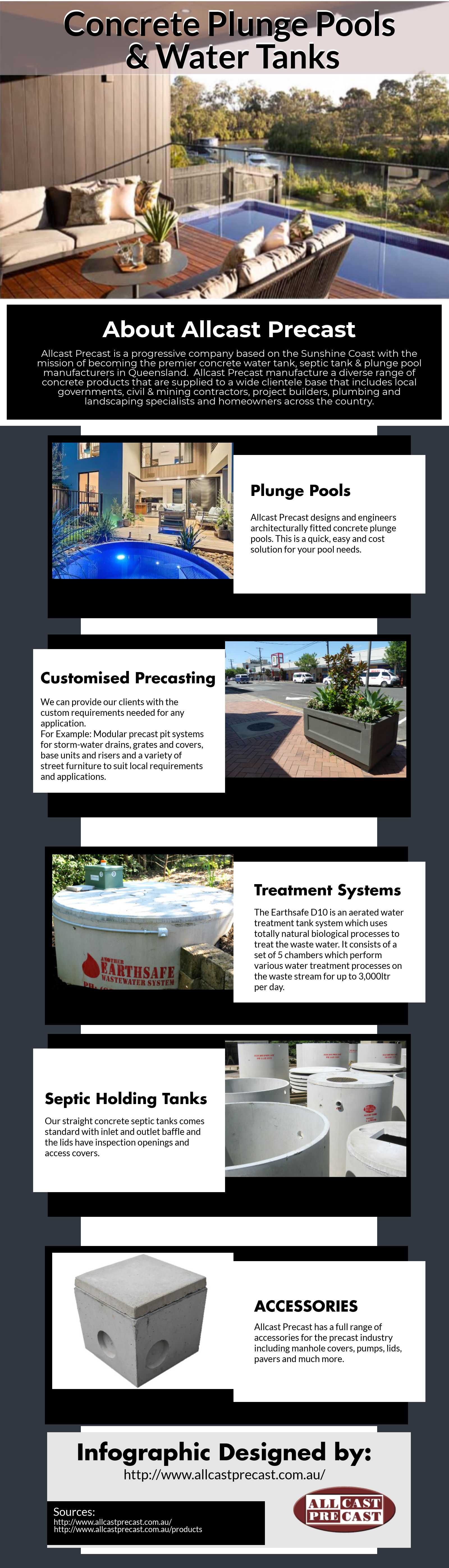 Allcast Precast is the solution for your plunge pool, septic tank and water tank needs. We manufacture all of our tanks in concrete because it has excellent insulating properties and keeps water cool in hot weather. Concrete tanks don’t rust, leak or cave in, and reduces the risk of algae or bacteria growth in the water. Our concrete water tanks are long lasting, low maintenance and fire resistant. For aesthetic purposes our water tanks can be installed above or underground, and fitted with camlock valve fittings for use of fire-fighting purposes.