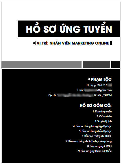 Hãy ghi điểm cho hồ sơ của bạn ngay từ ánh nhìn đầu tiên của nhà tuyển dụng. Giả sử, có 20 ứng viên nộp hồ sơ ứng tuyển, trong đó có bạn, 19 ứng viên khác mua các bì hồ sơ ngoài thị trường, trong khi bạn tự thiết kế một bì hồ sơ như thế này. Khi nhận hồ sơ bạn nghĩ nhà tuyển dụng sẽ xem bộ hồ sơ nào trước, mình dám chắc với các bạn nhà tuyển dụng sẽ xem bộ hồ sơ khác biệt nhất trong số còn lại. Con người luôn bị gây chú ý và kích thích sự tò mò bởi những điều khác biệt so với phần còn lại