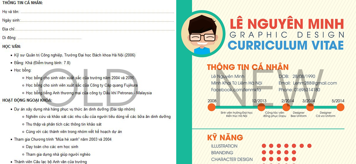 Khá là đẹp đúng không, không quá nhiều chữ gây nhàm chán mà thay vào đó là dạng thiết kế lồng hình ảnh, shape, vector, icon tượng trưng cho các câu chữ. Đặt vị trí bạn là 1 người tuyển dụng, bạn nhận 1 CV toàn chữ là chữ so với 1 CV sinh động thế này bạn sẽ muốn xem cái nào trước?